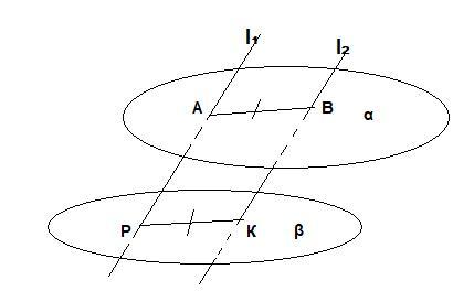 Параллельные прямые l1 и l2 пересекают плоскость альфа в точках А и В.Доказать,что любая плоскость,параллельная плоскости альфа,пересекает прямые l1 и l2 в точках,расстояние между которыми равно АВ.