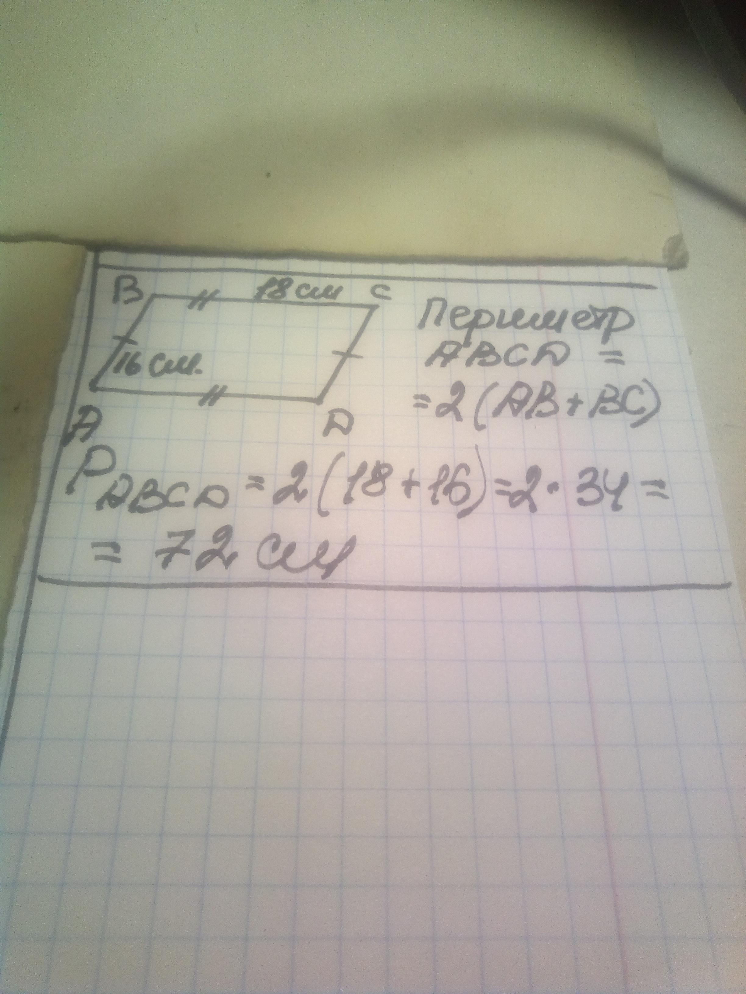 Объяснение:периметр - сумма длин всех сторон. противоположные стороны параллелограмма равны. поэтому 18+18+16+16=36+32=68/см/