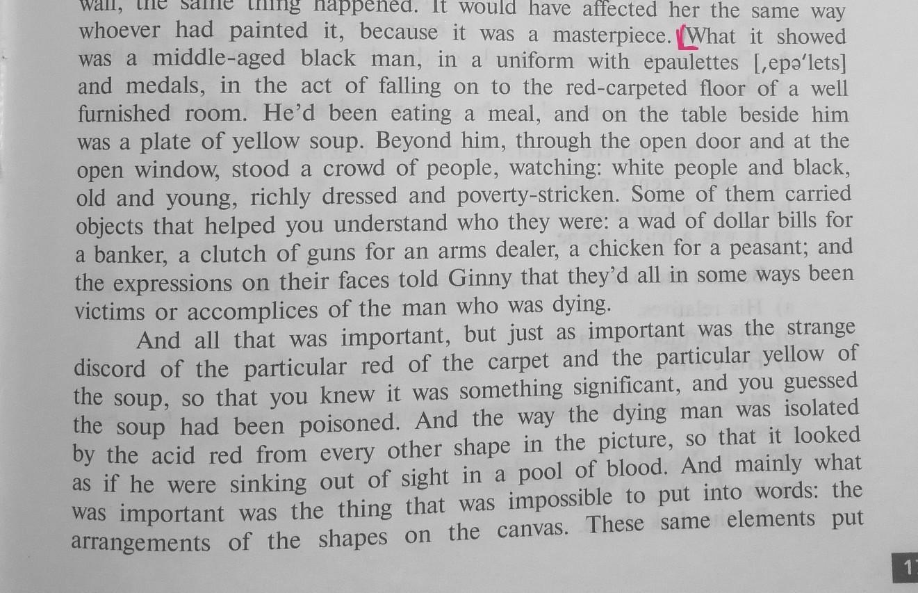 И все это было важно, но столь важно было странное разногласие особого красного ковра и особого желтого цвета супа, так, чтобы вы знали, что это было что-то существенное, и предположили, что суп был отравленным. И способом, которым умирающий человек был изолирован это кислотным красным от любой другой формы на картине, так, чтобы выглядело, как будто он тонул в луже крови. И главным образом то, что было важно, было вещью, которую было невозможно облечь в слова: расположение фигур на полотне. Эти же самые элементы, соединенные по-другому, были бы интересной картиной, но помещенные вместе так, они заставили Джинни задержать дыхание.