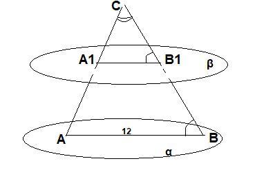 Сторона АВ треугольника АВС лежит в плоскости альфа.Плоскость бетта параллельна плоскости альфа и пересекает стороны АС и ВС в точках А1 и В1 соответственно.Найти длину отрезка А1В1,если АВ=12 см,СВ1:В1В=2:3