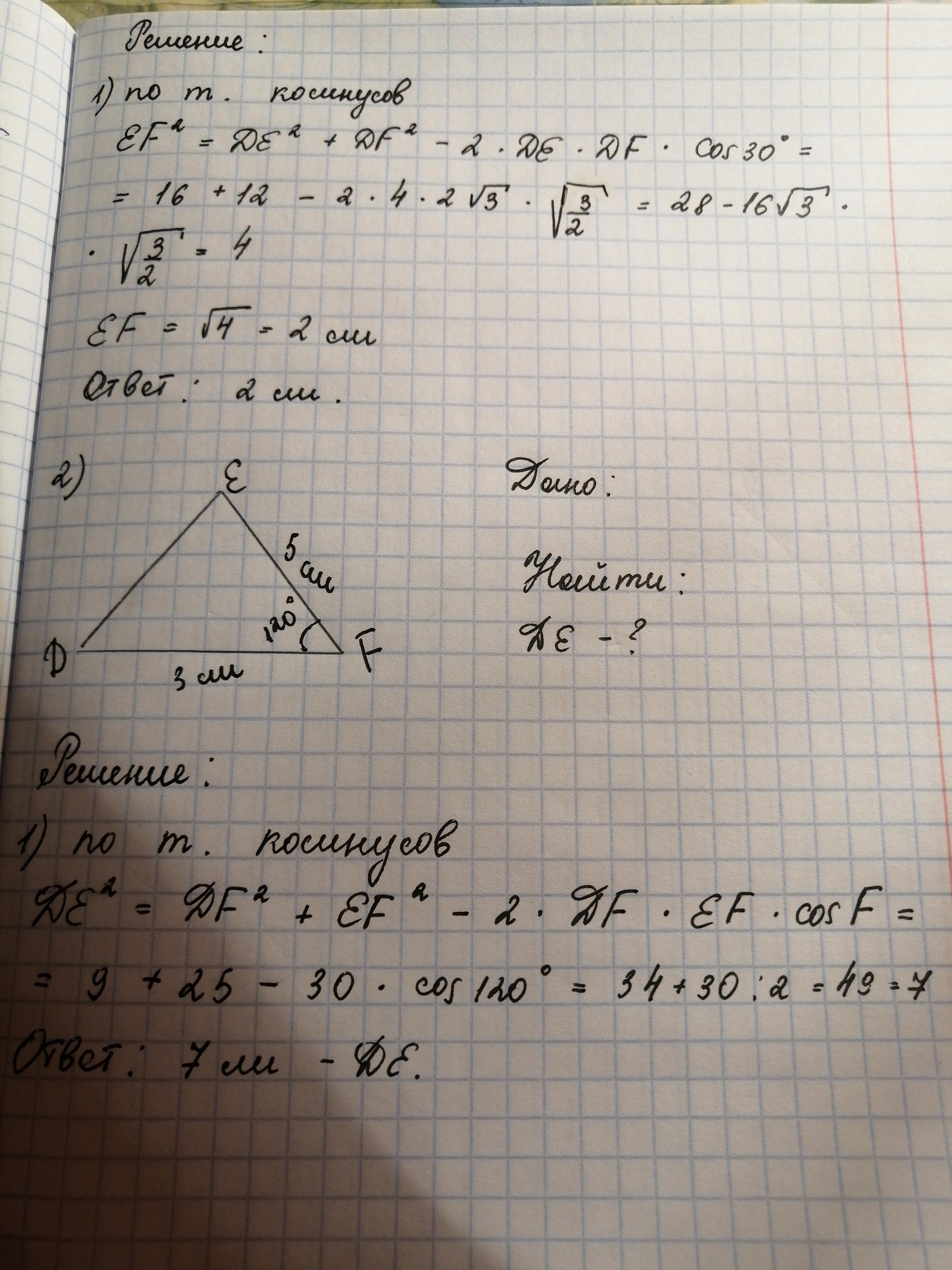 2. df = 3см, ef = 5 см, угол f = 120 градусам