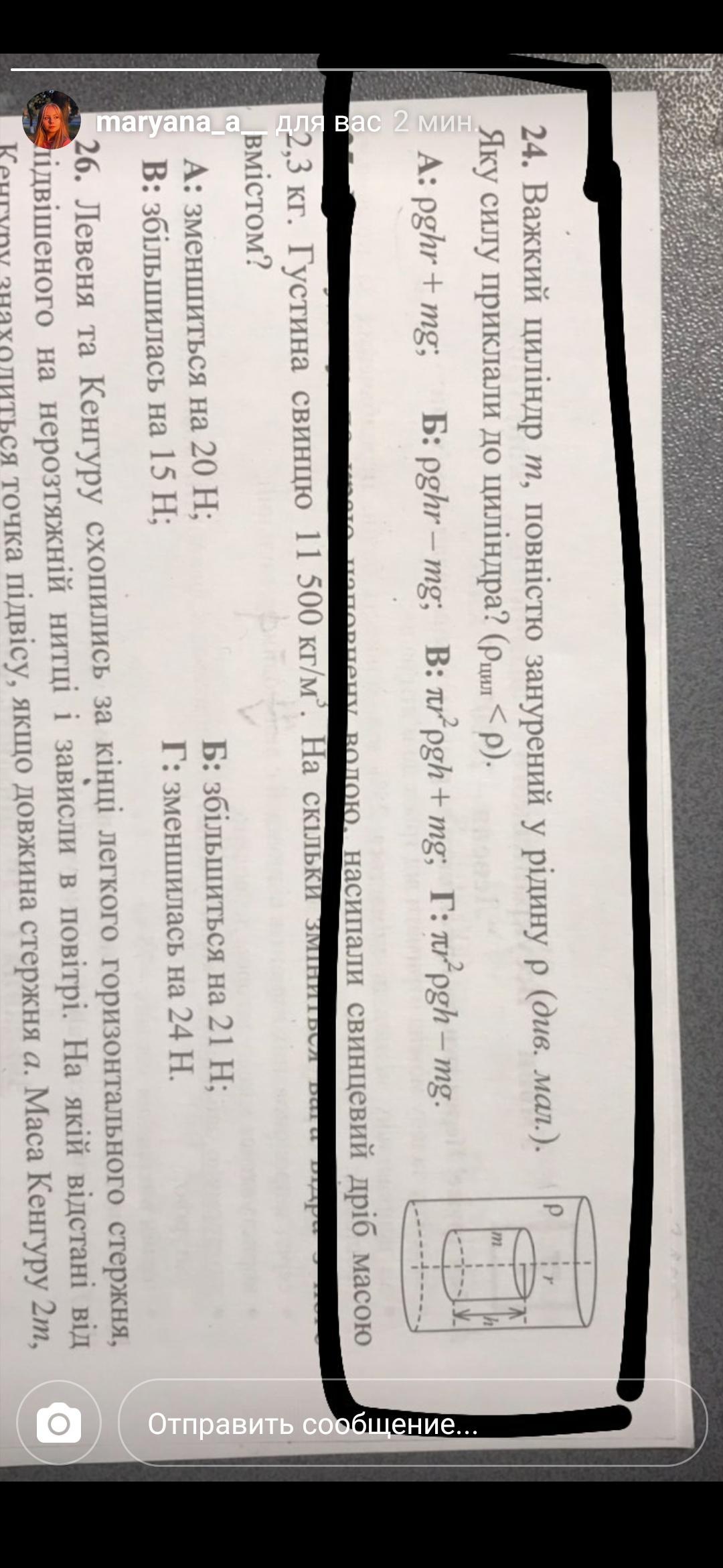 Важкий циліндр т, повністю занурений у рідину р (див. мал.). Яку силу приклали до циліндра? (Pция