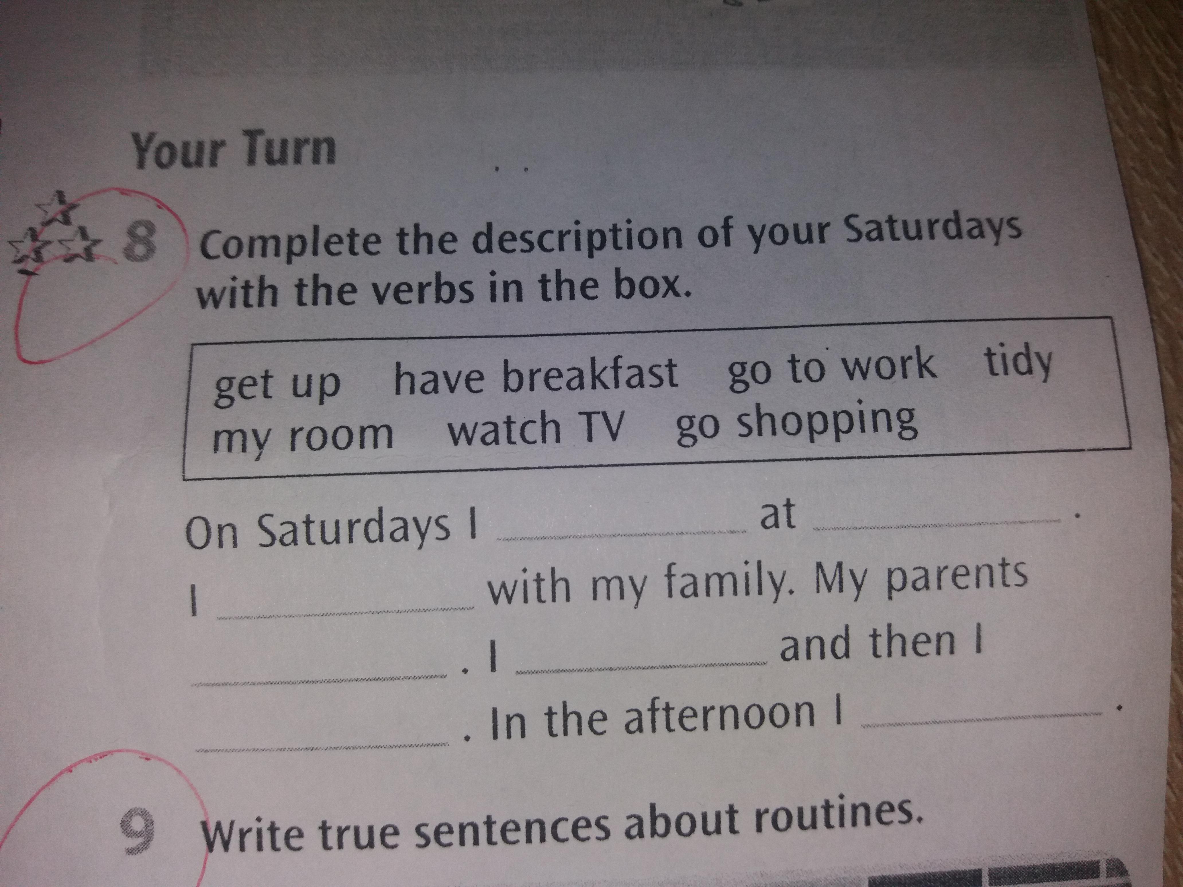 On Saturday I get up at 8 am. l have breakfast with my family. My parents go to work. I watch TV and then I tidy my room. In the afternoon I go shopping