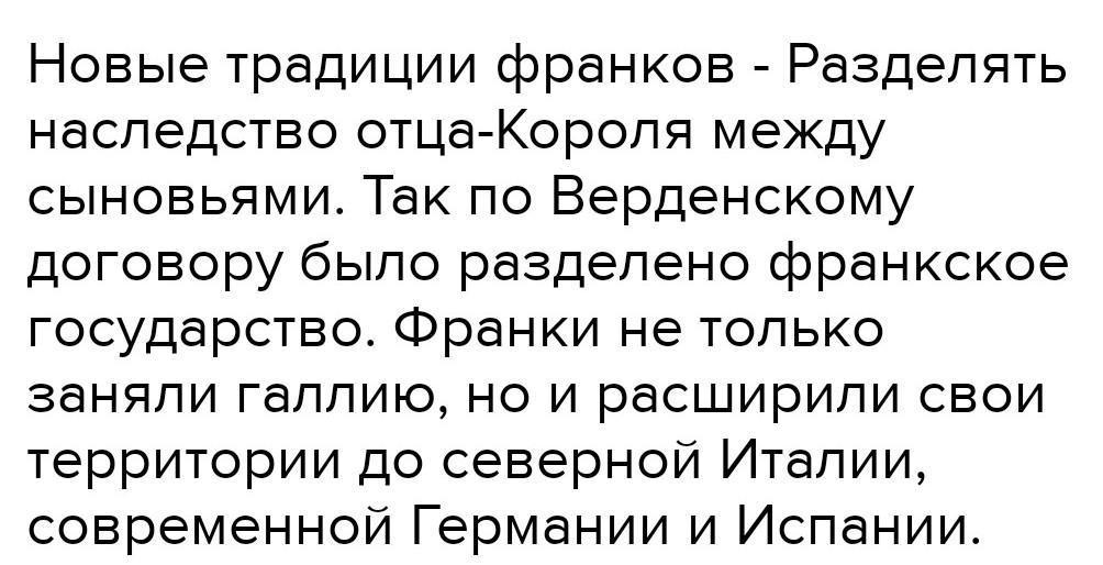 Новые традиции франков - Разделять наследство отца-Короля между сыновьями. Так по Верденскому договору было разделено франкское государство. Франки не только заняли галлию, но и расширили свои территории до северной Италии, современной Германии и Испании. Это мощное королевство в котором правили великие правители. (Карл Великий, Пипин Короткий)