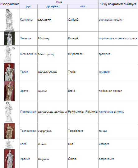 - Евтерпа (Эвтрепа) – музыки и лирической поэзии;