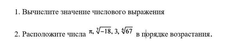 Поэтому ответ : (-18)^(1/7), (67)^(1/6), 3, пи