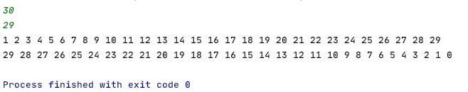 Программа ожидает ввода натурального числа N (0<N<30). На следующей строке она должна вывести на экран числа от 1 до N включительно через пробел. Ниже надо вывести эти же числа, но в обратном порядке.