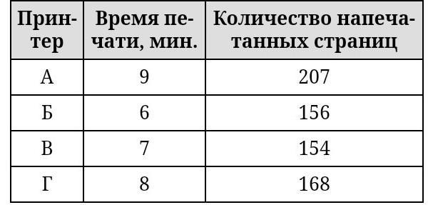 В таблице показано, сколько страниц и за какое время напечатал каждый из четырёх