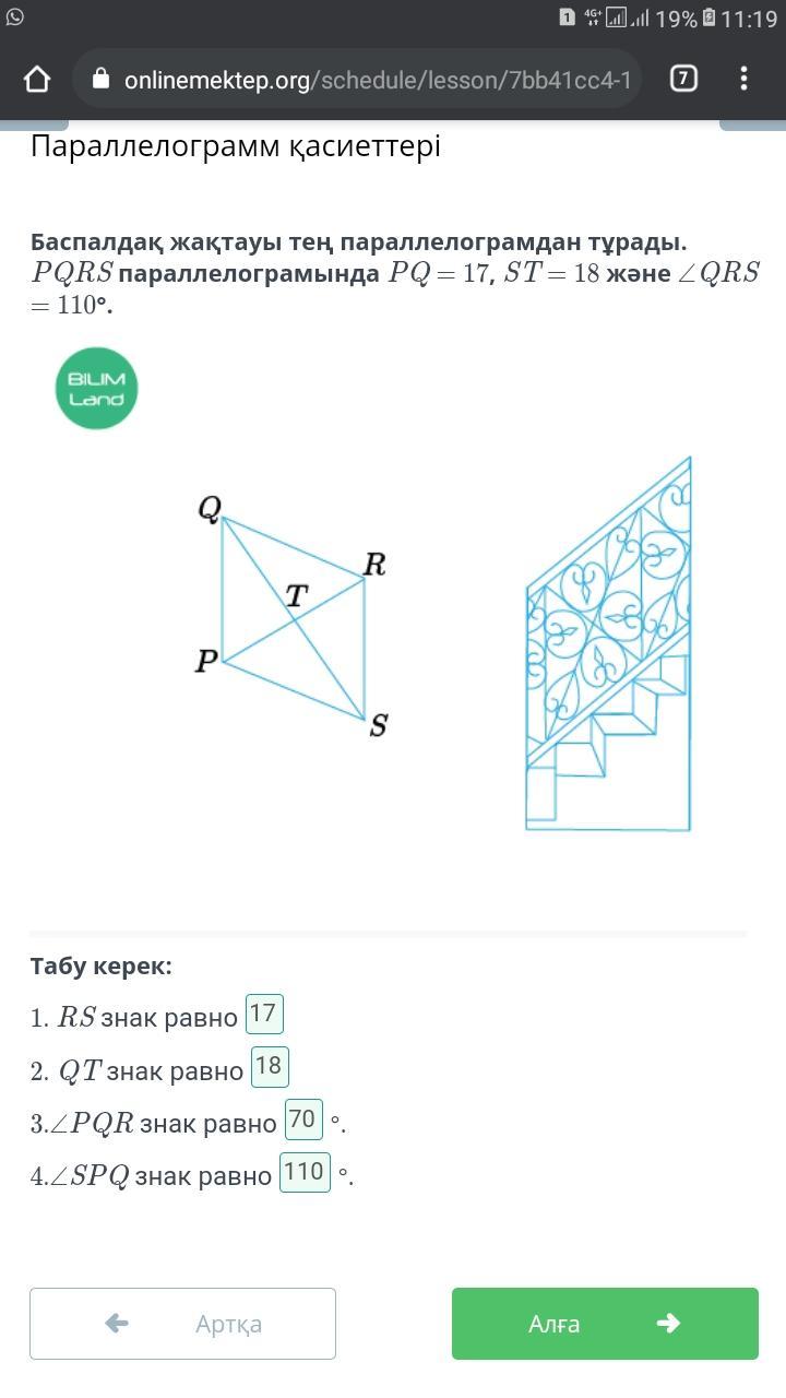 Баспалдақ жақтауы тең параллелограмдан тұрады. PQRS параллелограмында PQ = 17, ST = 18 және ∠QRS = 110°.