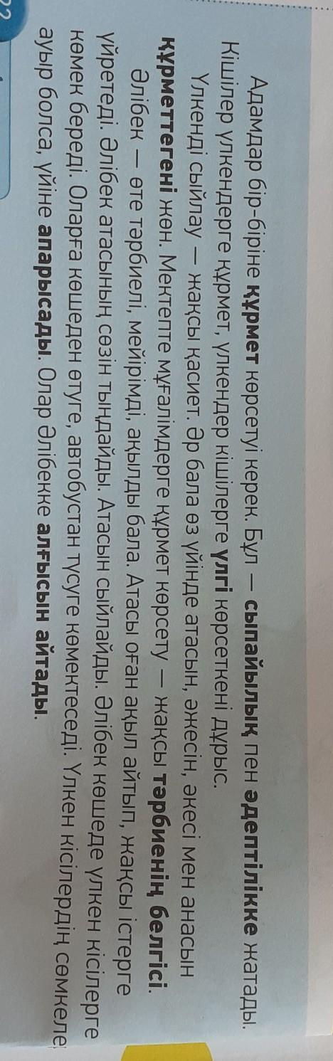 Адамдар бір-біріне кұрмет көрсетуі керек. Бұл —сыпайылық пен әдептілікке жатады. Кішілер үлкендерге кұрмет, үлкендер кішілерге үлгі көрсеткені дұрыс. Үлкенді сыйлау-жаксы касиет. Әр бала өз уйінде атасын, әжесін, әкесі мен анасын құрметтегені жөн. Мектепте мұғалімдерге кұрмет керсету-жаксы тәрбиенің белгіcі. Әлібек- өте тәрбиелі, мейірімді, акылды бала. Атасы оған ақыл айтып, жаксы істерге уйретеді. Әлібек атасының сөзін тындайды. Атасын сыйлайды. Әлібек көшеде үлкен кісілерге көмек береді. Оларға көшеден өтуге, автобустан түсуге көмектеседі. Үлкен кісілердің сөмкелер aуыр болса, үйіне апарысады. Олар Әлібекке алғысын айтады.