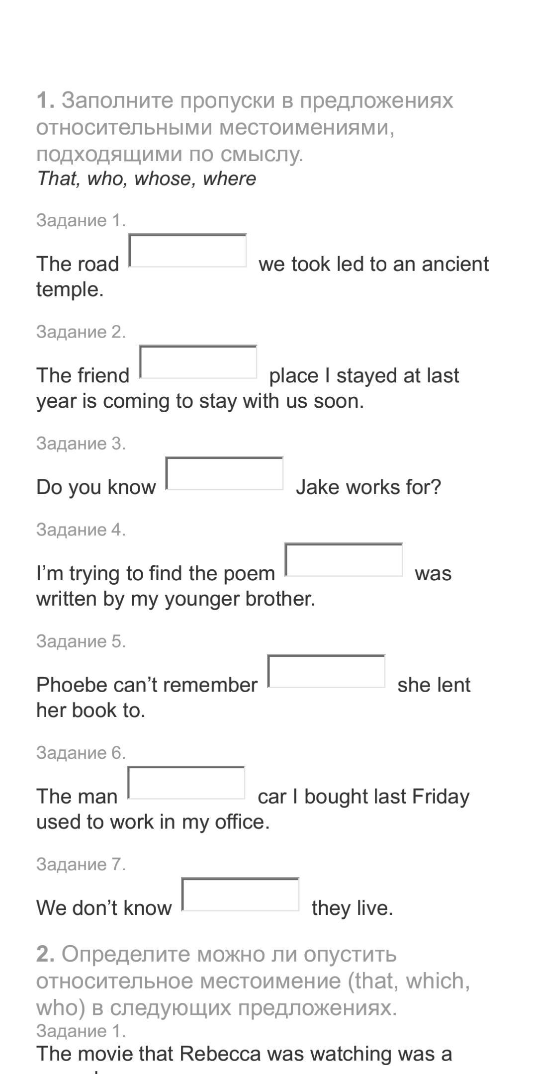 Английский язык, нужно вставить that, who, whose или where, используя правило relative clause