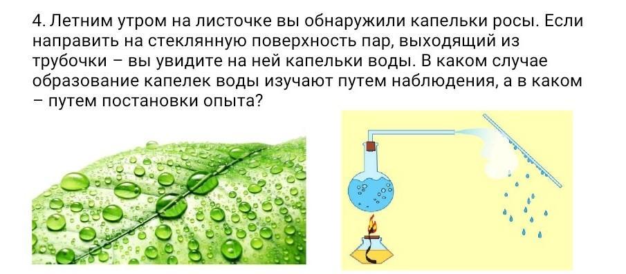 Летним утром на листочке вы обнаружили капельки росы. Если направить на стеклянную поверхность пар, выходящий из трубочки – вы увидите на ней капельки воды. В каком случае образование капелек воды изучают путем наблюдения, а в каком – путем постановки опыта?