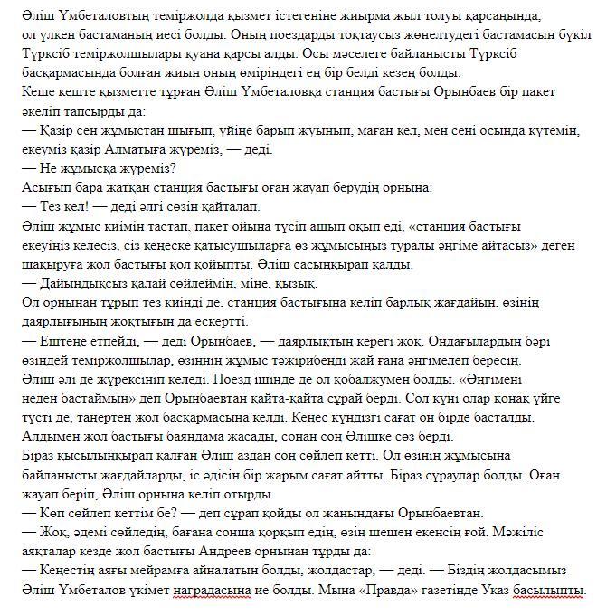 1. Сөйлемдерді қажетті сөздермен толықтырыңыз. (дополните предложения нужными вловами ) А) Әліш ______________________________20 жыл жұмыс істеп, үлкен бір іс бастады. В) Түpксіб жұмысшылары Әліштің поездарды ____________________жөнелту идеясын қуанышпен қабылдады. С) Әліш Үмбеталов теміржолдағы жиырма бес жыл .______________________ сіңірген еңбегі үшін орденмен марапатталды.