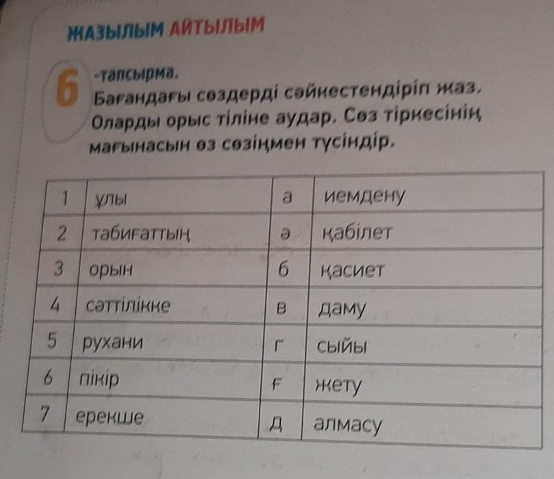 Бағандағы сөздерді сәйкестендіріп жаз.