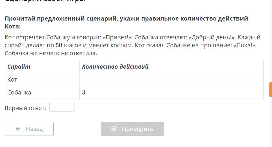 Прочитай предложенный сценарий, укажи правильное количество действий Кота: Кот встречает Собачку и говорит: «Привет!». Собачка отвечает: «Добрый день!». Каждый спрайт делает по 50 шагов и меняет костюм. Кот сказал Собачке на прощание: «Пока!». Собачка же ничего не ответила. Спрайт Количество действий Кот Собачка 3
