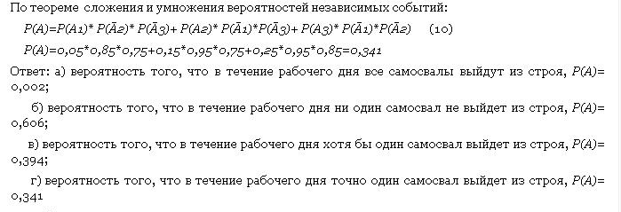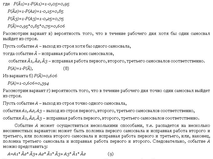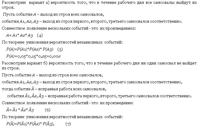 Вероятность поломки (выхода из строя) в течение дня у каждого из трех работающих самосвалов равна соответственно р1, р2, р3. Какова вероятность того, что в течение рабочего дня: