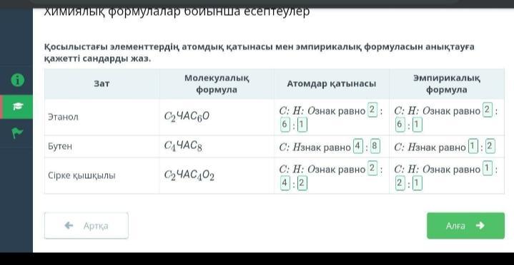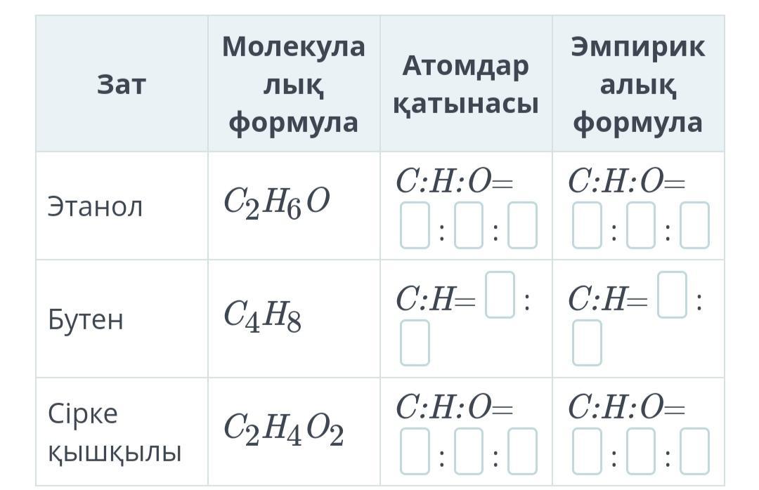 Химиялық формулалар бойынша есептеулер Қосылыстағы элементтердің атомдық қатынасы мен эмпирикалық формуласын анықтауға қажетті сандарды жаз.