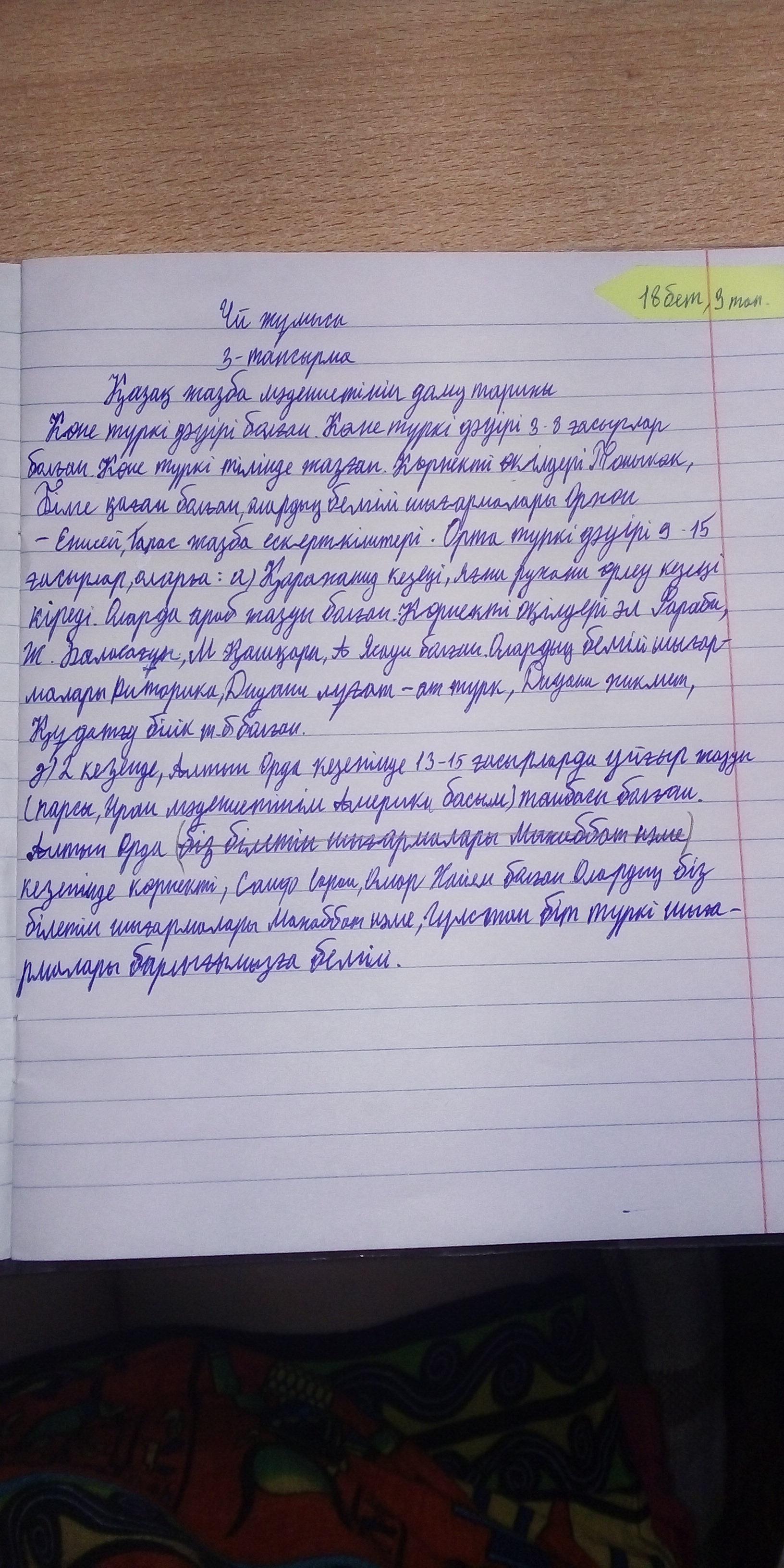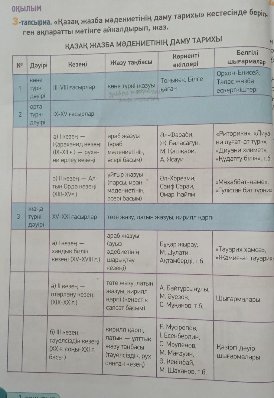 «Қазақ жазба мәдениетінің даму тарихы» кестесінде берілген ақпаратты мәтінге айналдырып, жаз.
