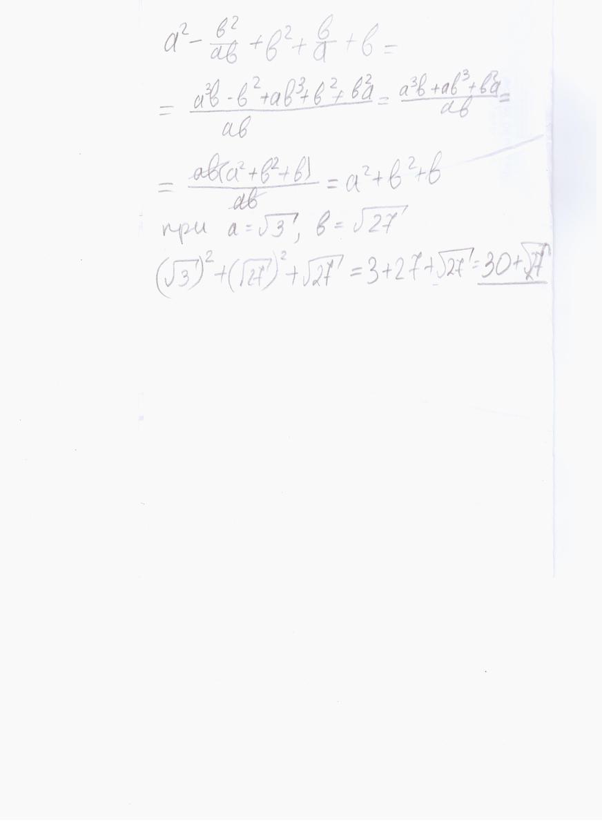 a^2-b^2/ab+b^2+b/a+b при а корень из 3 и b корень из 27