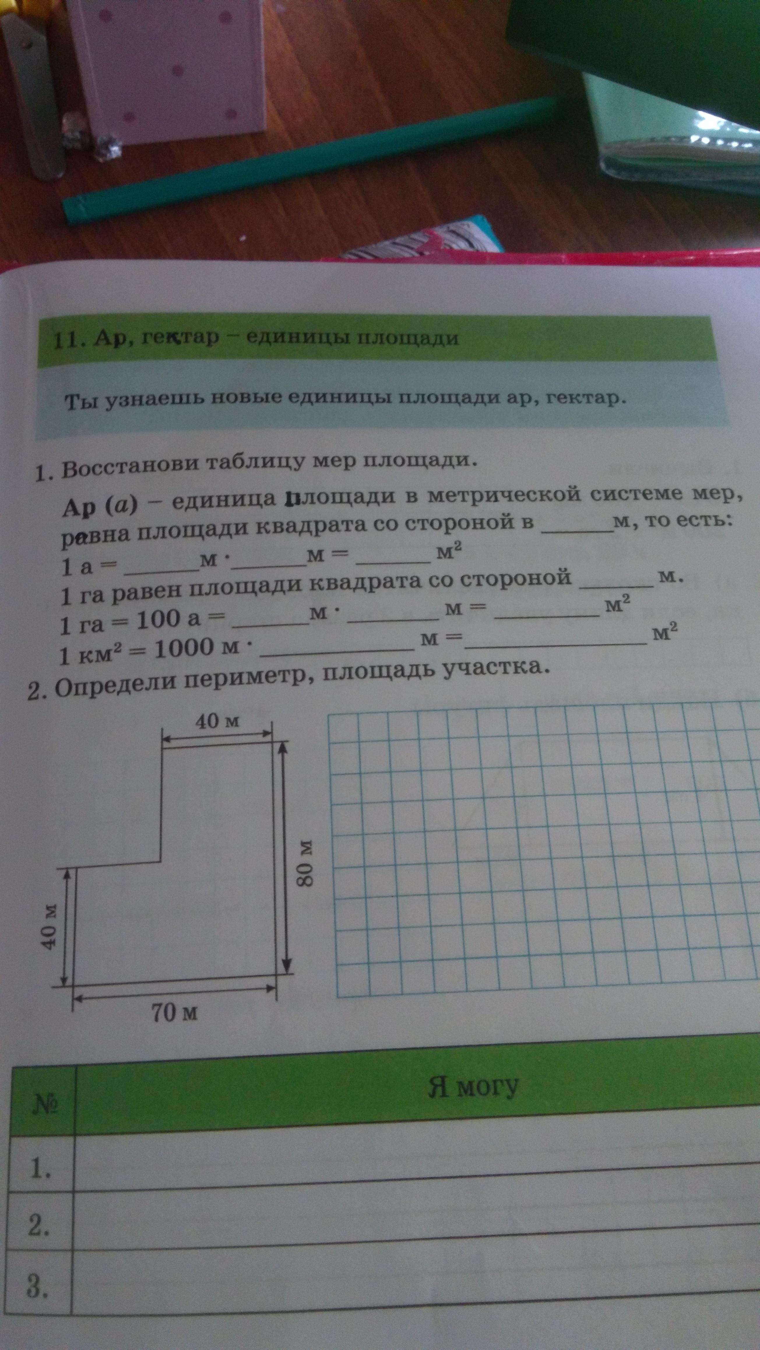 Помогите пожалуйста. Восстанови таблицу мер площади. Определи периметр, площади участка