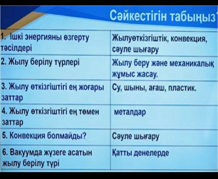 Ответ:2-1; 1-2; 3-қатты денелер 4-су шыны,.....5-металл; 6-Сəуле арқылы