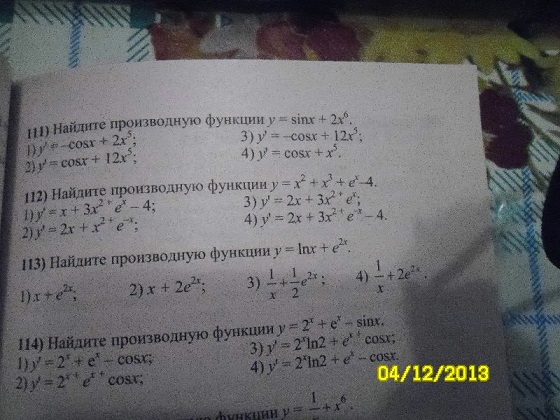 111. y = sin x + 2x^6, y' = cos x + 12x^5. Ответ 2)