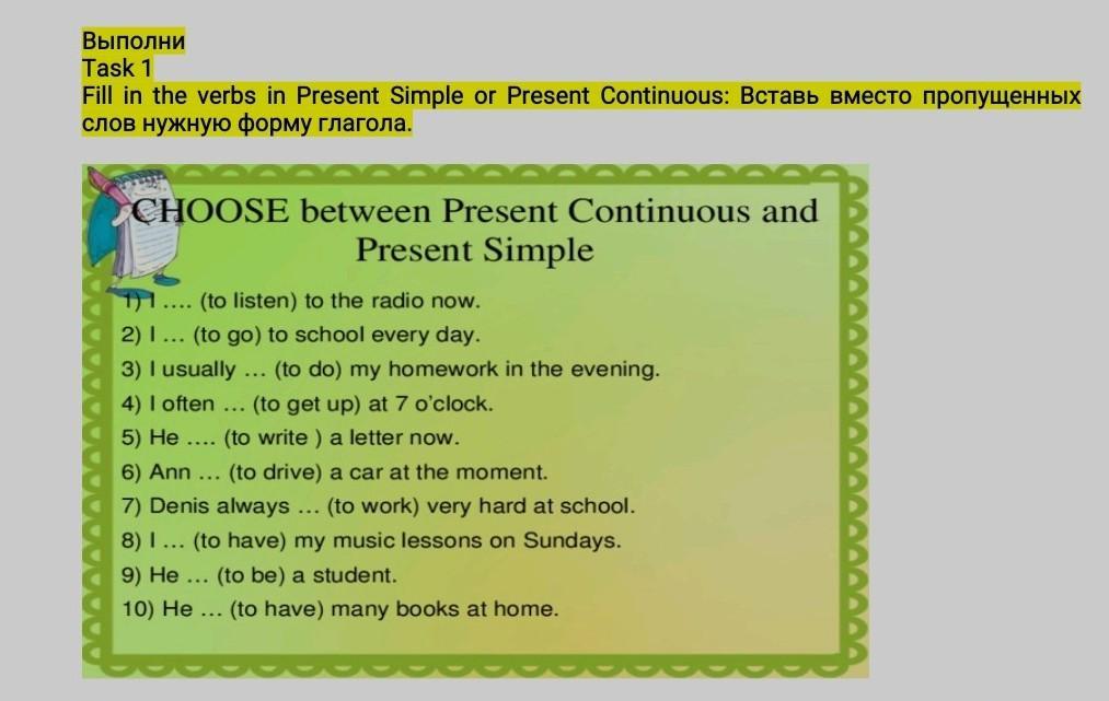 1) am listening 2) go 3) do4) get up5) is writing 6)is driving 7) working 8) have 9) is10) have
