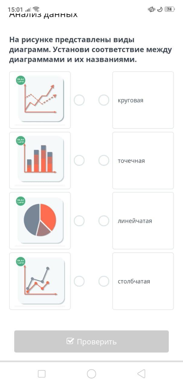 На рисунке представлены виды диаграмм . Установи соответствие между диаграммами и их названиями