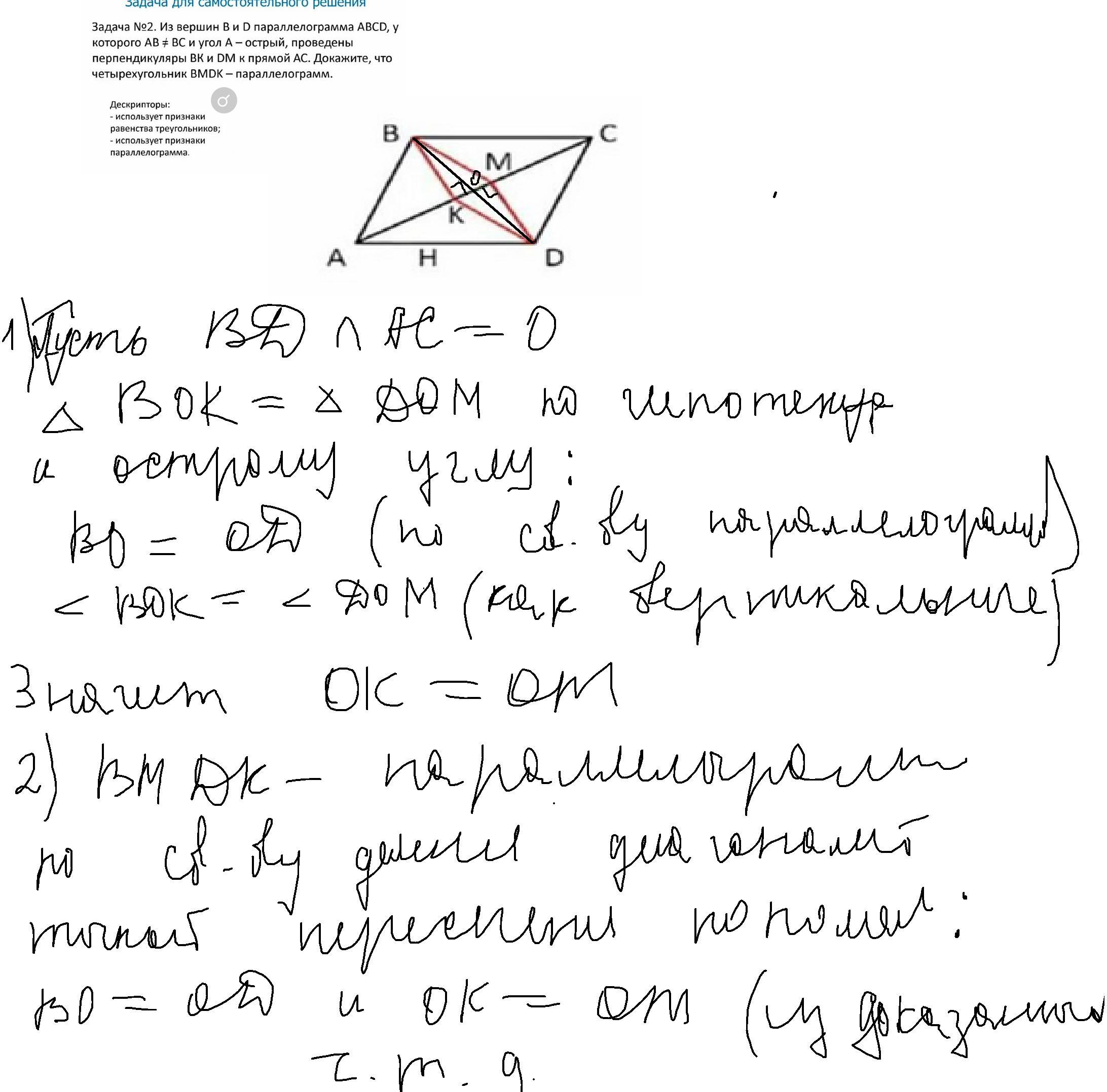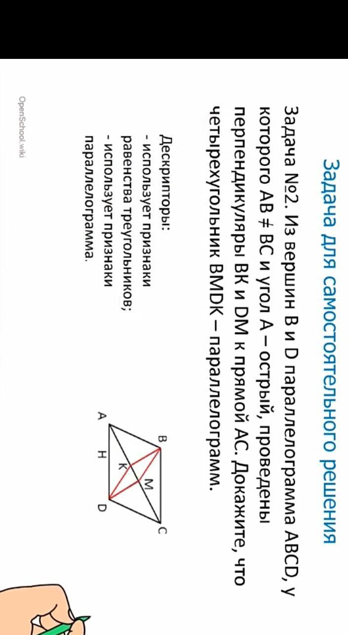 Применяя признаки параллелограмма, докажите, что четырехугольник BMDK параллелограмм.