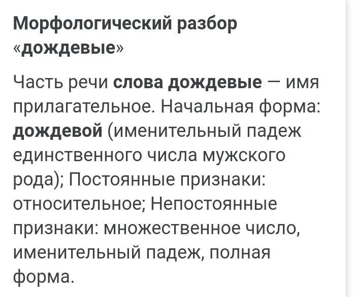 часть речи слова дождевые - иия прилагательное . Начальная форма : дождевой ( иминительный подеж , единственного числа , мужского рода ) ; Постоянные признаки: относителное; Непостоянные