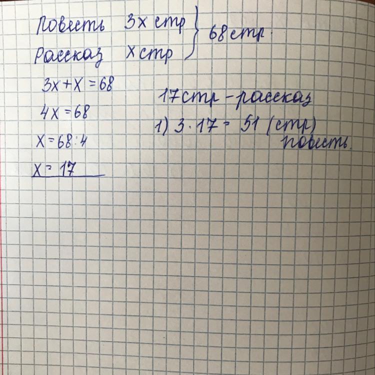В книге,где напечатаны рассказ и повесть,68 страниц.Повесть занимает в 3 раза больше страниц,чем рассказ.Сколько страниц занимает рассказ и сколько-повесть?Решить задачу только дано