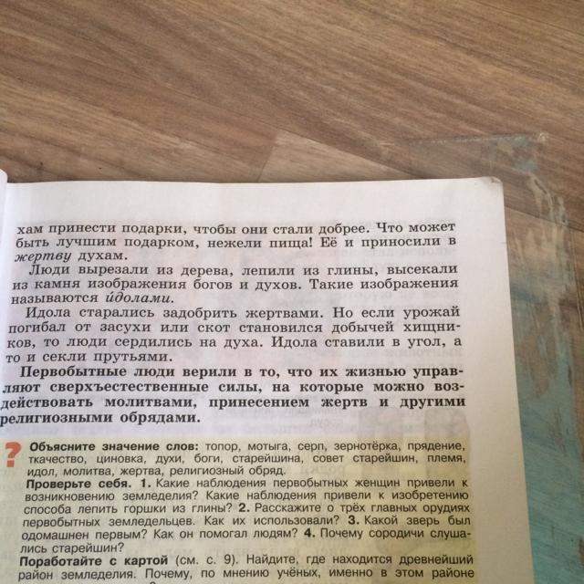 Первобытные земледельцы использовали каменный топор, деревянную мотыгу и серп. Каменный топор состоял из деревянного топорища и примотанного к нему кожаными ремнями заостренного камня. Деревянная мотыга представляла собой палку с сучком. Серп изготавливали из дерева или кости, немного расщепляя их и вставляя в расщеп острые камешки. Топором первобытные люди рубили деревья, чтобы расчистить участок земли для земледелия. Мотыгой они вскапывали землю, а серпом срезали колосья зерновых, когда они поспеют.