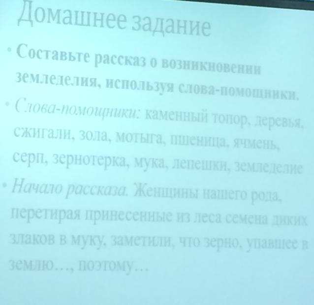 Женщины нашего рода, перетирали зернотеркой, принесённые из леса семена диких злаков, в муку, заметили, что зерно, упавшее на землю проросло, поэтому они стали откладывать и далее выращивать, так зародилось земледелие. Люди каменными топорами рубили деревья, сжигали их и освобождали землю для полей. Поля обрабатывали мотыгой, в качестве удобрения использовали золу. Вырастив пшеницу, ячмень, при помощи серпа собирали урожай, перемалывали зерно в муку. Так женщины научились земледелию.