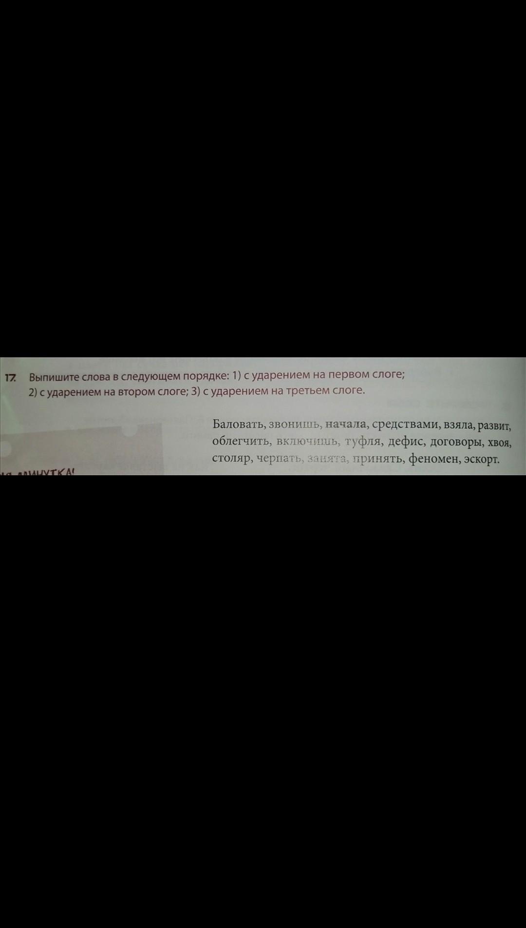 1)Средствами, развит, туфля, хвоя, включишь;2)Звонишь, взяла, дефис, столяр, черпать, принять, феномен, эскорт, облегчить; 3)Баловать, начала, договоры, занята.