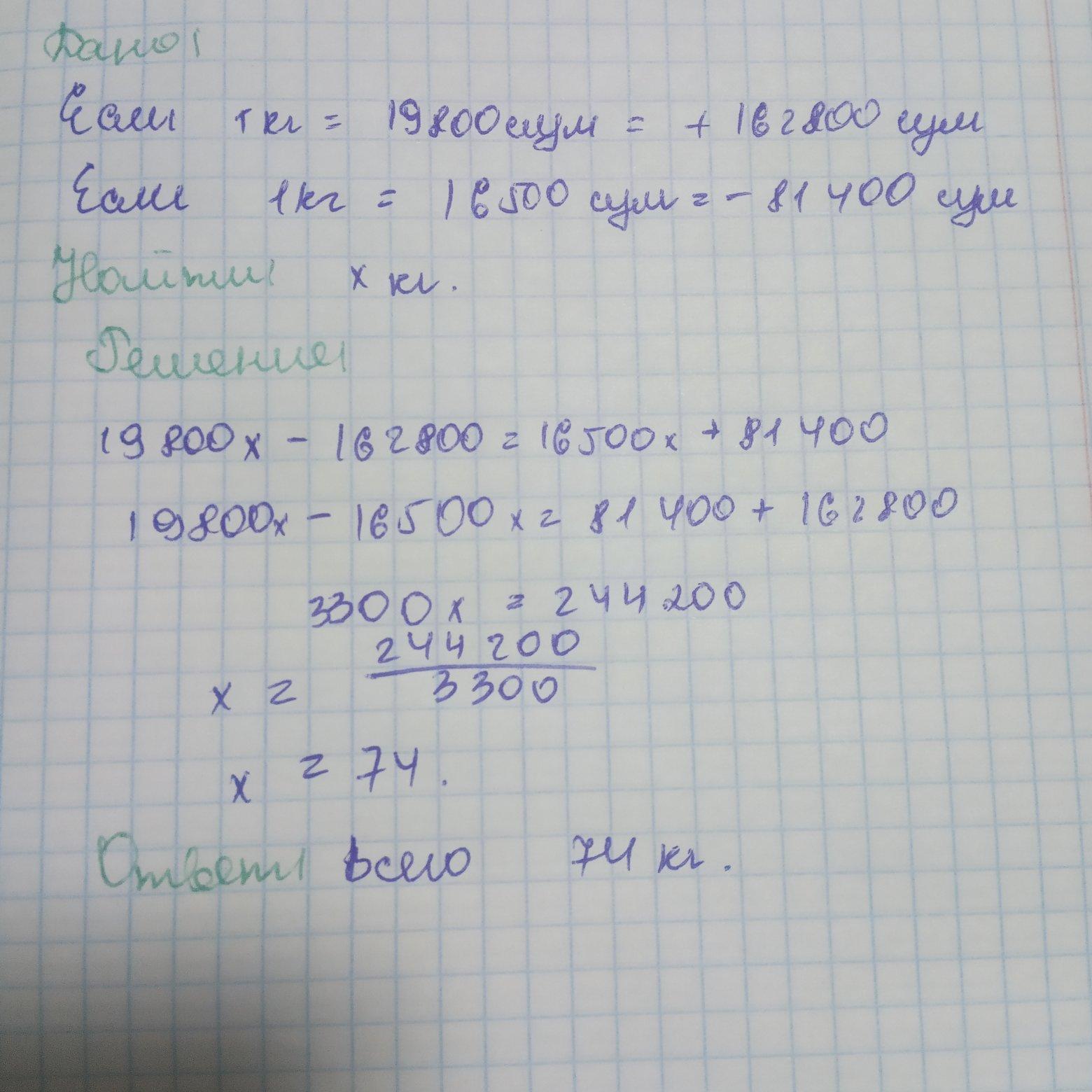 Если производитель продаст свои изделия по 19800 сумов за 1 килограмм, то получит 162800 сумов прибыли . Если же он будет пробовать свои издели по 16500 сумов за 1 килограмм , то его убыток составит 81400 сумов . Сколько килограммов изделий было ? Можно с условием пожалуйста. Нужно очень срочно