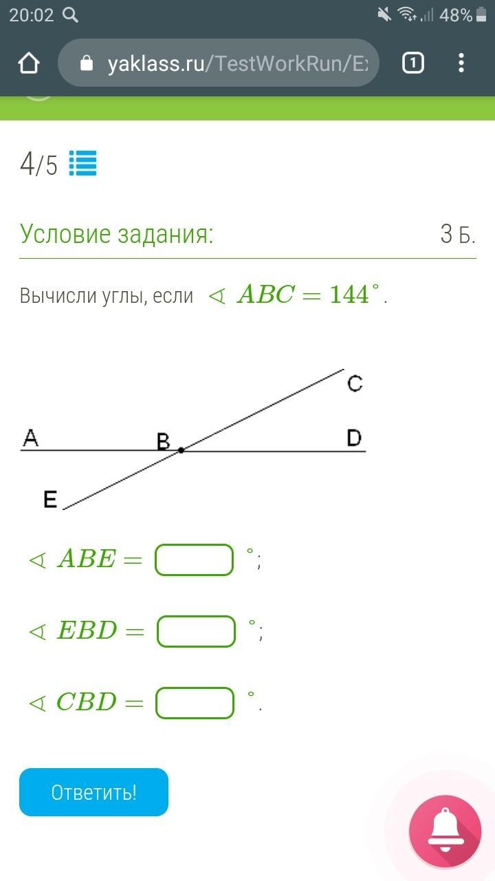А угол EBD равен углу который 144 градуса также по свойству вертикальных углов EBD - 144 градуса