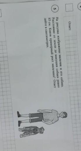 На рисунке изображены мальчик и его собака .Расстояние от земли до макушки равно 85 см.Каков примерный рост мальчика?Ответ дайте в сантимертах