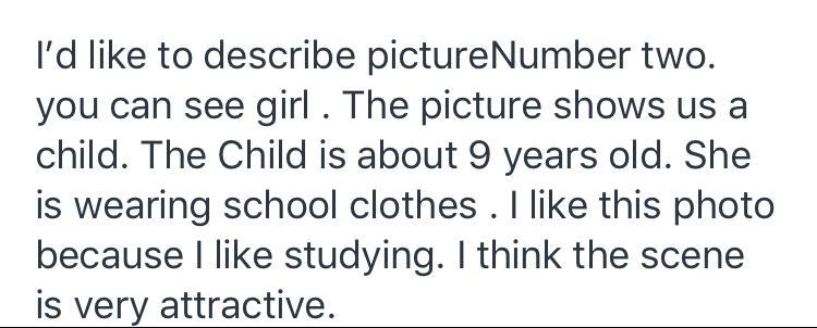 I’d like to describe pictureNumber two. you can see girl . The picture shows us a child. The Child is about 9 years old. She is wearing school clothes . I like this photo because I like studying. I think the scene is very attractive.