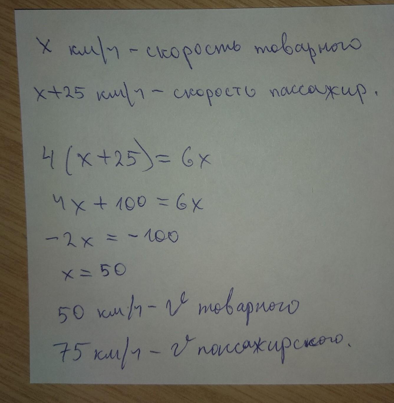 Пассажирский поезд за 4 часа прошёл такой же путь как товарный за 6 часов . Найти скорость каждого поезда если скорость пассажирского на 25 км/час больше скорости товарного .
