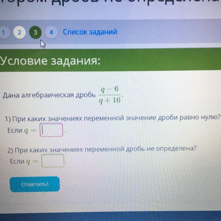 1) дробь равна нулю, когда числитель равен нулю: q - 6 = 0 => q = 6