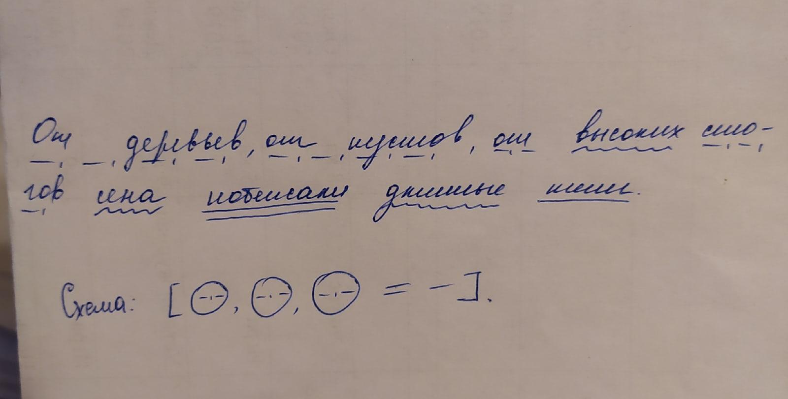 выполните синтаксический разбор предложения от деревьев от кустов от высоких стогов сена побежали длинные тени