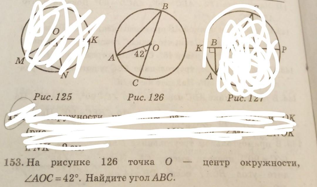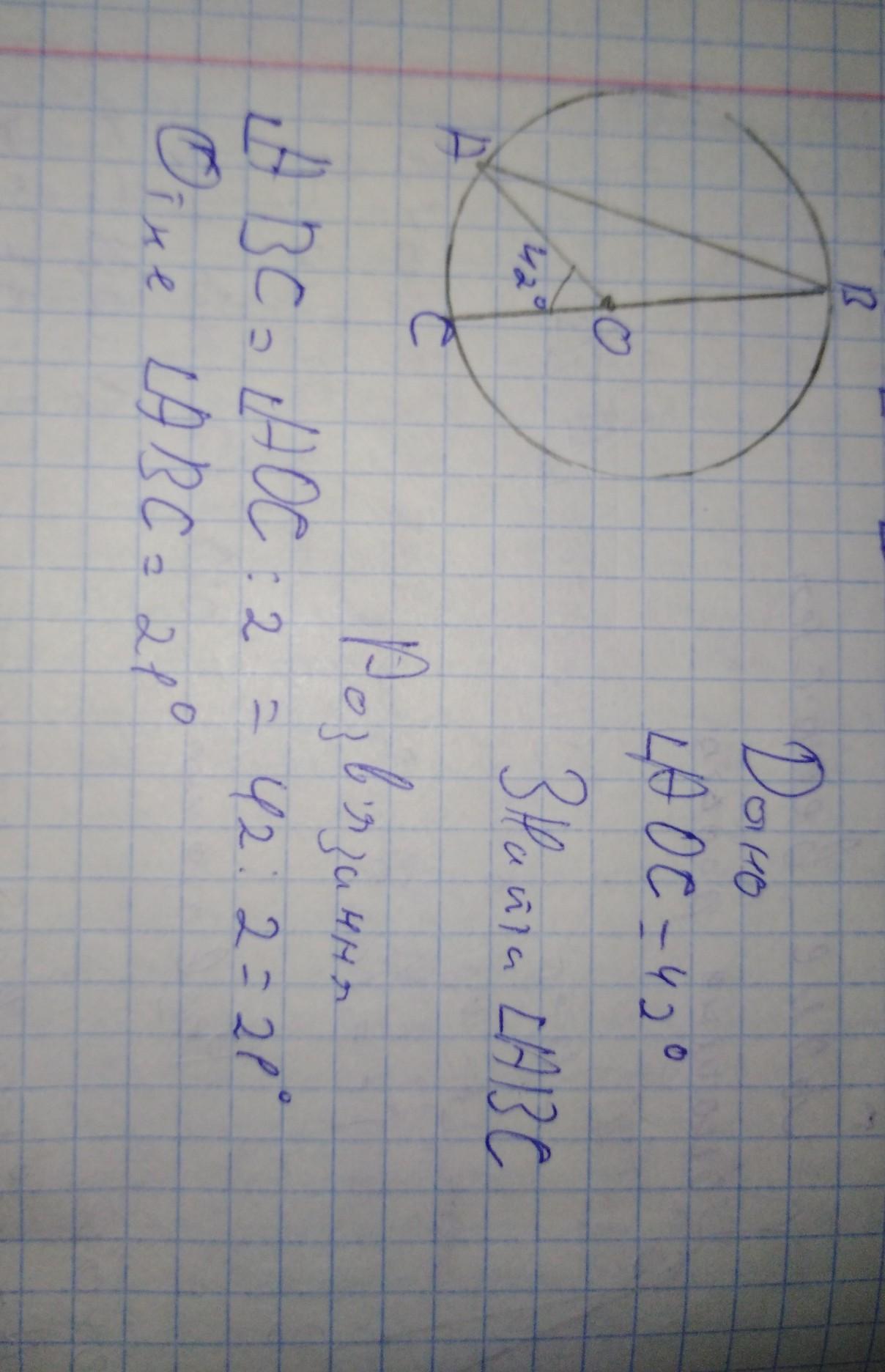 <ВОС=180° развернутый угол. <АОВ=<ВОС-<АОС=180°-42°=138°. Треугольник АОВ равнобедренный. АО=ОВ=r. В равнобедренном треугольнике углы при основании равны между собой. Сумма углов в треугольнике равна 180°. <АВС=(180°-138°)/2=42/2=21°