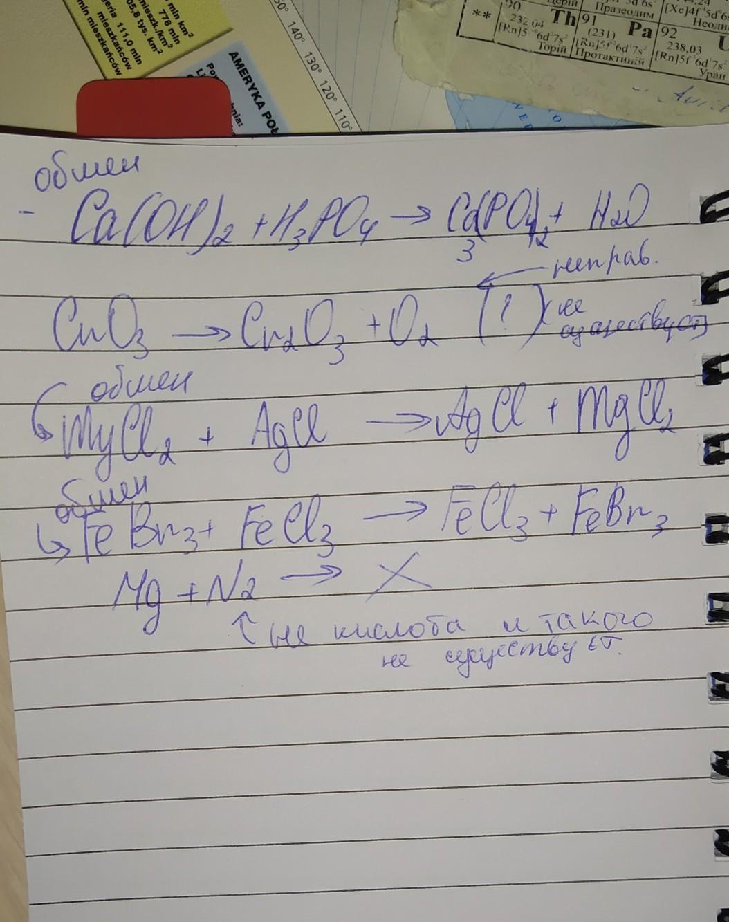 Помогите пожалуйста с химией, задание на картинке. Нужно сказать какая это реакция (Соединение, Разложение, Замещение, Обмен) и, собственно, произвести эти реакции, Приравнивать обязательно. (даю 20 баллов)