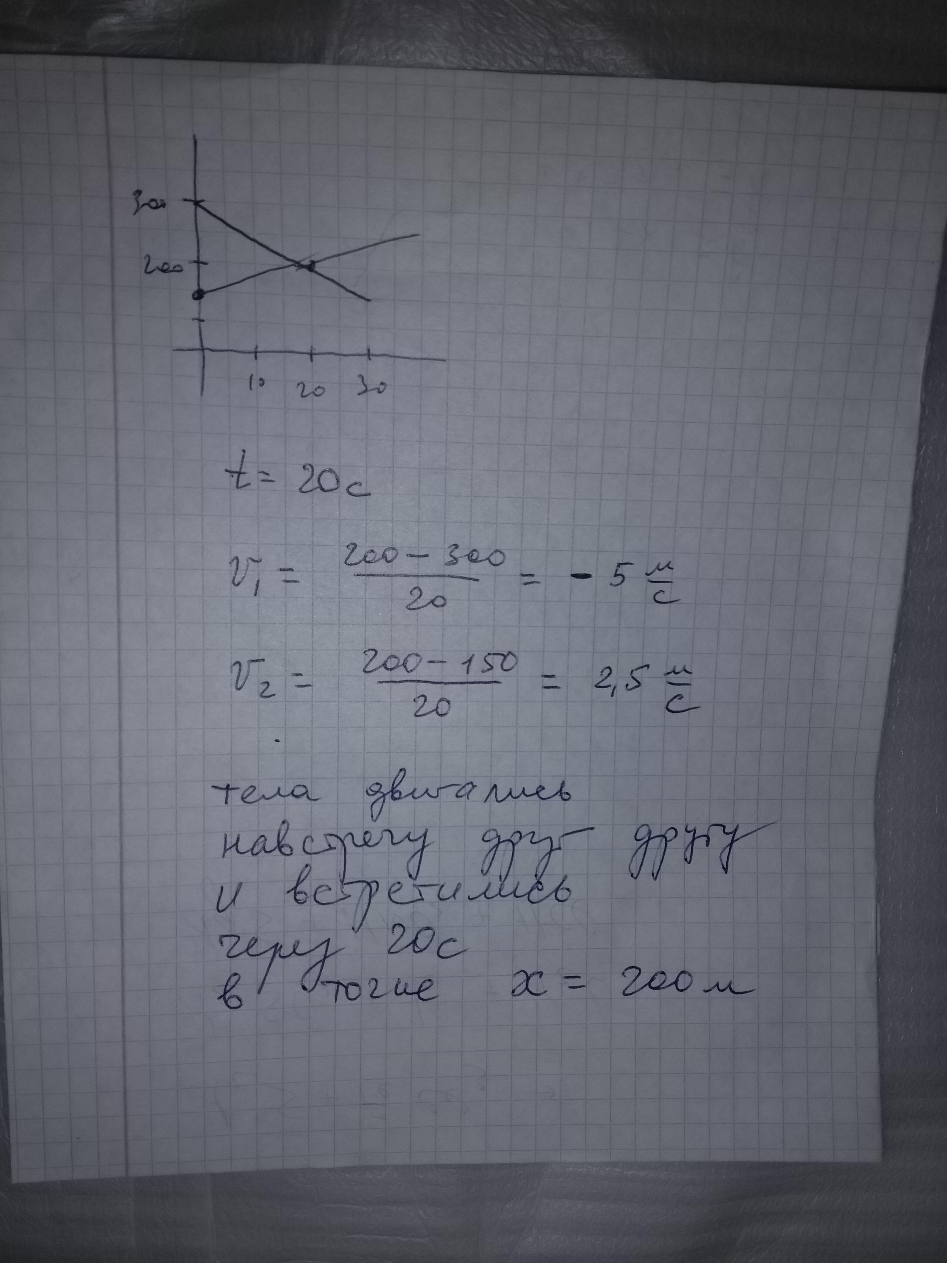 Точка пересечения показывает, что оба тела через 20 с после начала наблюдения за телами находились в точке 200 м от начала отсчета. Если у них была одинаковая координата, значит они встретились. После встречи стали удаляться друг от друга.