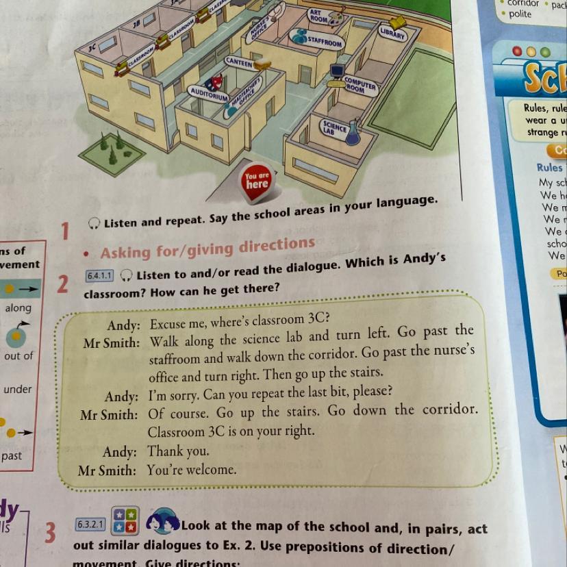 How can he get there?(как он может дойти туда?) Читаешь ответ Mr Smith ( walk along the science .... then go up the stairs)