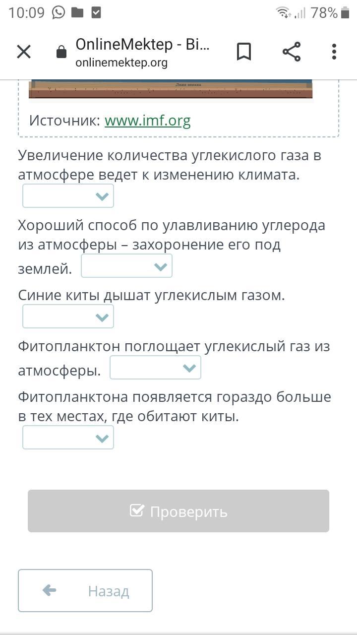 Помогите срочно !!!!! Даю 30 балов Животные на страже климата Прочитай текст. Выбери верное или неверное утверждение. 1) Научные исследования убедительно свидетельствуют, что наш углеродный след – выбросы углекислого газа (CO2) в атмосферу, которые способствуют глобальному потеплению, – в настоящее время представляет угрозу для экосистемы планеты. 2) Многие предлагаемые решения проблемы глобального потепления, такие как прямое улавливание углерода из атмосферы и его захоронение глубоко под землей, являются слишком сложными, непроверенными и дорогостоящими. 3) А что если существует не требующее сложных технологий решение данной проблемы: не только эффективное, но и недорогое? 4) Примером такой потенциальной возможности является удивительно простая и по сути «нетехнологичная» стратегия по улавливанию большего количества углерода из атмосферы: увеличение мировой популяции китов. 5) Морские биологи недавно обнаружили, что киты, особенно синие, играют важную роль в поглощении углерода из атмосферы. 6) Кроме того, в последние годы ученые обнаружили, что киты оказывают действие «Китового насоса» на образование фитопланктона в местах своего обитания. 7) Эти микроскопические существа (фитопланктон) не только производят не менее 50 процентов всего кислорода в атмосфере, но и поглощают при этом порядка 37 млрд. тонн CO2, что составляет примерно 40 процентов всего выделяемого углекислого газа в мире. 8) Для сравнения: мы подсчитали, что это эквивалентно количеству CO2, которое поглощают 1,7 трлн. деревьев (что равно четырем массивам лесов Амазонки). 9) Чем больше фитопланктона – тем больше поглощается углерода. 10) Таким образом, защита китов может увеличить шансы на сохранение экологии и человечества.