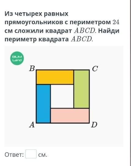Из четырех равных прямоугольников с периметром 24 см сложили квадрат ABCD. Найди периметр квадрата ABCD