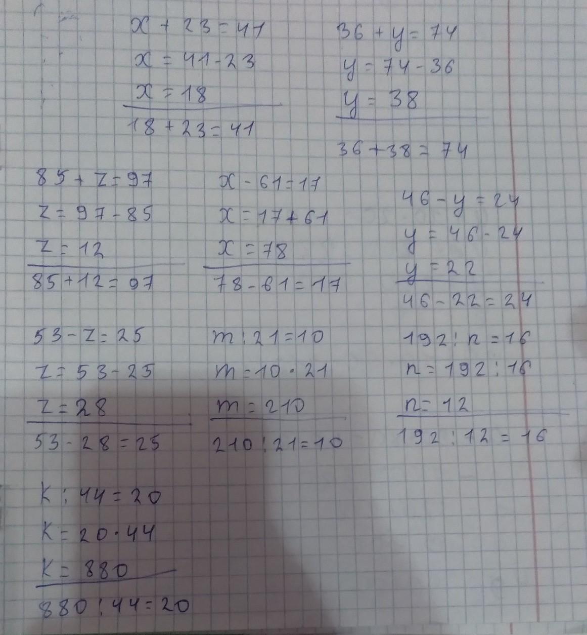 1)х+23=41 2)36+у=74 3)85+z=97 4)x-61=17 5)46-y=24 6)53-z=25 7)m:21=10 8)192:n=16 9)k:44=20 Решите уравнения gj;fkeqcnf