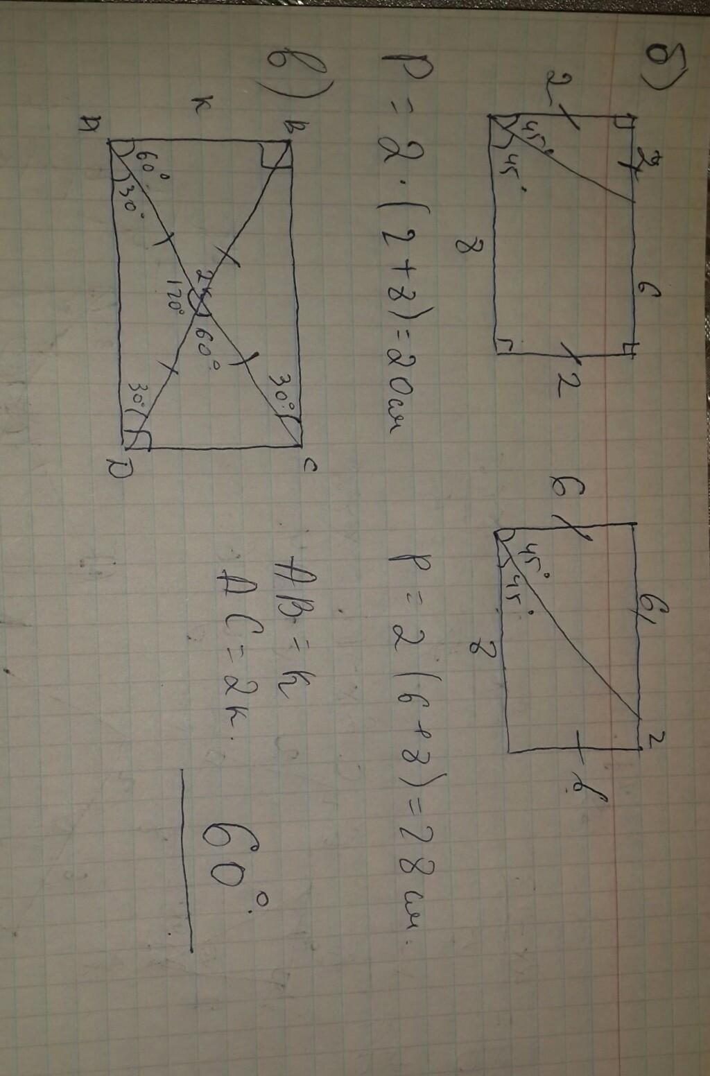 б) Биссектриса угла A прямоугольника ABCD делит сторону BC на части 2 см и 6 см. Найдите периметр прямоугольника. в) Найдите меньший из углов между диагоналями прямоугольника если его меньшая сторона относится к диагонали как 1:2.