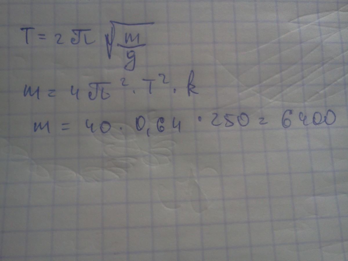 Решить задачу. Определите массу груза, который на пружине жесткостью 250Н/м совершает 40 колебаний за 32 секунды.